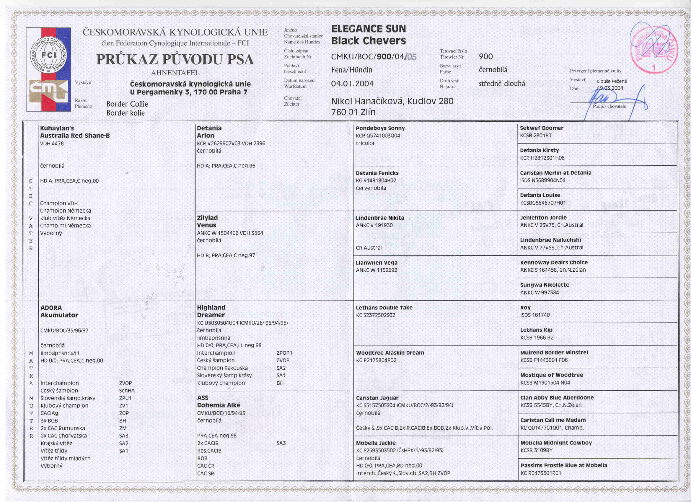 ![]() 4. 1. 2004 - 20. 1. 2016 barva: černobílá číslo zápisu: ČMKU/BOC/900/04/05 výška: 52 cm PRA/CEA/KAT. - negativní v 6týdnech věku a v 18měsících DNA/CEA Optigen: carrier DKK: 2/2 CHOVNÁ Bonitační kód: 2/2 iimbasnnnna/Q1W3 průkaz původu Složené zkoušky: LA1, LA2, ZVOP, ZOP, ZPU1, ZPU2, ZPU S, ZZO, ZVV1, ZVV2, ZVV3, ZPO1, ZPS1, ZPS2, IPO1, IPO2, IPO3, VPG/SchHA, VPG/SchH1, VPG/SchH2, VPG/SchH3, FPr1, FPr2, FPr3, canisterapeutická zkouška Výstavy: Český šampion, Slovenský šampion, Slovenský junior šampion, CAJC, CAC, res. CAC Klubový šampion BCCCZ Závody FOTKY VIDEA ![]()